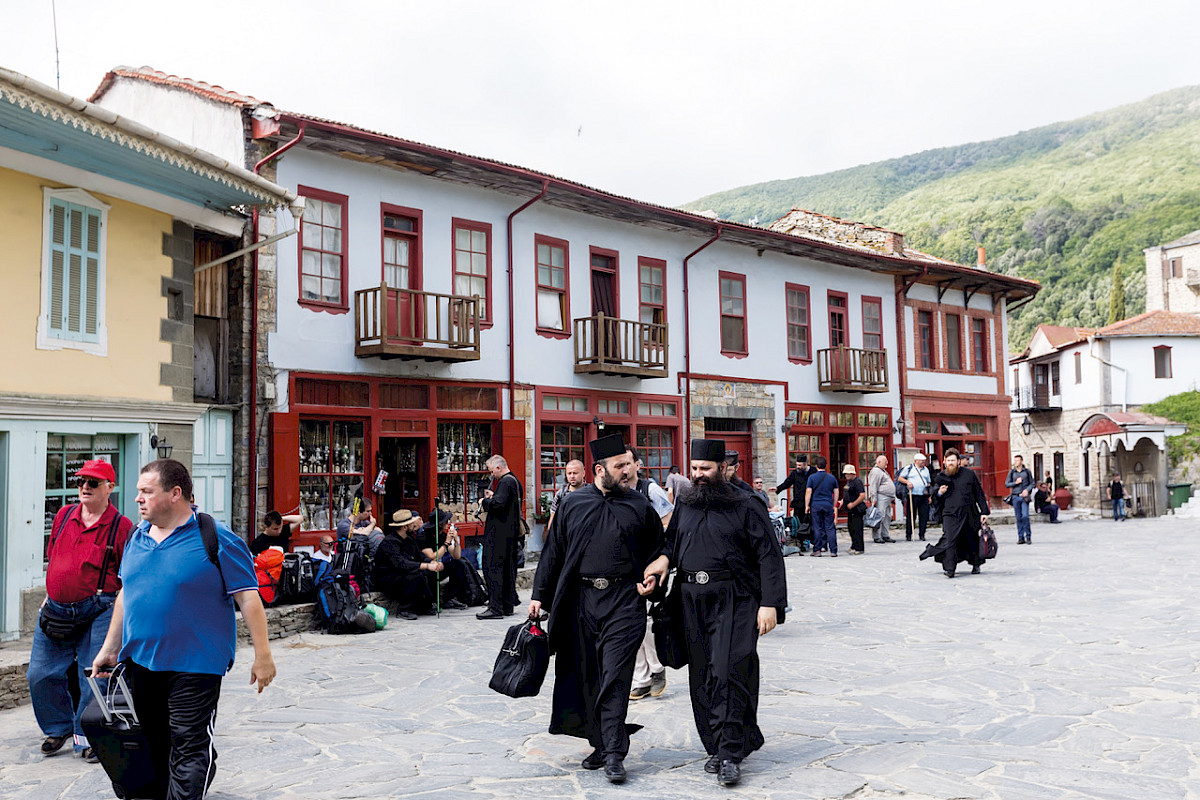 De volgende ochtend gaat een lang gekoesterde wens van mij in vervulling: bezichtiging van Mount Athos, een van de drie schiereilanden van Chalkidiki. Athos, voluit de Autonome Monastieke Staat van de Heilige Berg Athos, is een geheimzinnige plek die je uitsluitend per boot vanaf zee kunt bereiken en alleen als je een visum hebt én een man bent. Het schiereiland telt maar liefst 20 orthodoxe kloosters en nergens zijn vrouwen toegestaan. Als man kun je alleen terecht als je een meerdaagse retraite boekt, maar omdat me daar helaas de tijd voor ontbreekt beperk ik me tot een boottocht langs de Egeïsche kust van Mount Athos, met werkelijk grandioze uitzichten op de indrukwekkende kloostercomplexen. In totaal leven er op Athos nog zo’n 2300 monniken die in hun levensonderhoud voorzien door productie van onder meer wijn en olijven. Ze leven uiterst eenvoudig en houden zich alleen bezig met bidden, mediteren en werken. De reden dat vrouwen niet zijn toegestaan ligt in de Oosters-Orthodoxe traditie die voorschrijft dat vrouwen niet in de nabijheid van monniken mogen zijn om hun spirituele focus en toewijding aan God niet te verstoren.