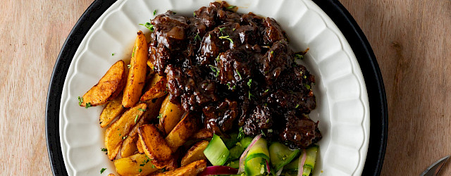 Klassieke gerechten met een verrassende twist. We beginnen met Limburgs zoervleis, een traditioneel stoofgerecht uit het zuiden van Nederland. Het vlees wordt zachtjes gegaard in een zoet-zuur mengsel, waarbij de toevoeging van balsamico-zilveruitjes zorgt voor een verfijnde, frisse smaak die perfect het hartige vlees aanvult.
