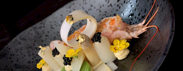 Kook 8 asperges in een vacuüm zak gaar en snijd deze op maat. Maak van de overige stukjes een asperge mayonaise- en aspergesaus. Ontdoe de langoustines van de kop en vul 4 koppen met farce van langoustines. Bak de langoustines eventjes met gepekelde citroen in een pan. Garneer het geheel af met avocado, rauwe asperge en aspergesaus of eventueel een paar druppels langoustine olie.