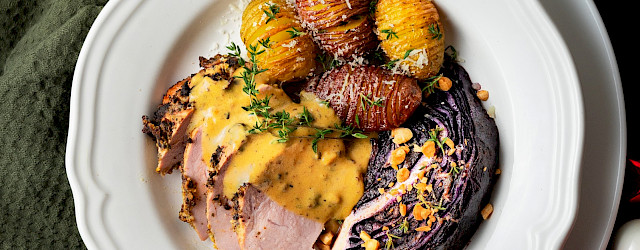 Beenham met geroosterde rode kool en hasselback aardappelen