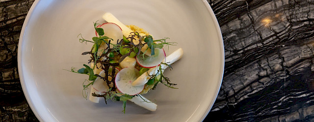Als deze gaar afgieten in een vergiet en af laten koelen. Breng de bulgur op smaak met een beetje fijn gesneden bieslook, een gesnipperd uitje en een beetje aspergemarinade. Schil de asperges en breng deze in koud water met zout aan de kook. Gedurende 1 minuut zacht laten koken en vervolgens af laten koelen. De asperge in 3 à 4 stukken snijden en marineren met de aspergemarinade. Plaats de aangemaakte bulgur in het midden van het bord. Maak verder op met de doperwten, in schijfjes gesneden radijsjes, jonge sla en gemarineerde asperges bij.