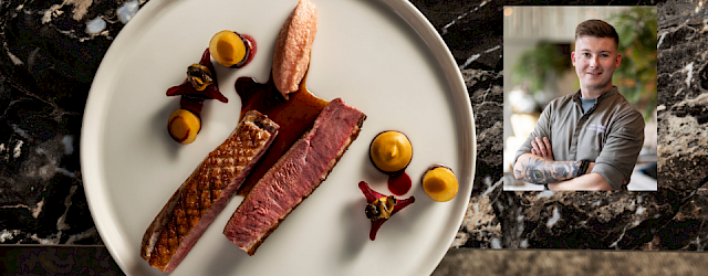 Chef de cuisine Sven Cobben neemt het hoofdgerecht voor zijn rekening. Qua smaak, kleur en textuur een echte winterse uitschieter op het menu van Kasteel Bloemendal. De canette (vrouwelijke eend) wordt bijgestaan met verschillende bereidingen van biet en pompoen met een saus van sinaasappel. “Het is echt de kookstijl van ons team”, vertelt Sven. “Modern maar met klassieke sauzen. We hebben een klassieke jus getrokken waar we sinaasappelschil in laten trekken. Echt een moderne kookstijl met klassieke basis”, licht hij toe. Het team van de chef is divers en blijft creatief bezig met seizoensgebonden gerechten en menu’s. “En dat op een heel betaalbare manier. Daar onderscheiden we ons echt in.”