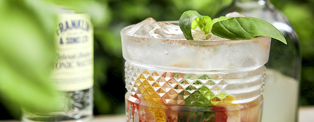 Vul een tumblerglas met ijs. Voeg de gin, likeur en het limoensap toe en roer tot gemengd. Vul aan met de tonic en garneer met een beetje grapefruit en een vers blaadje basilicum.