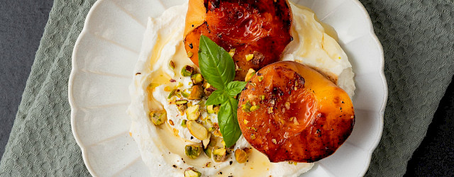 Frisse ricotta met gegrilde perzik en pistache