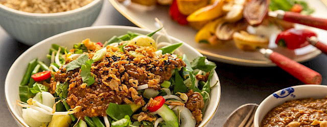 Kook de eitjes, pel ze en snijd ze in kwarten. Snijd de komkommer in de lengte doormidden en ris er met een lepel de zaadjes uit. Snijd er mooie dunne halve maantjes van. Nu kun je alles stapelen. Aardappelen, boontjes en bovenop de taugé. Of je maakt een gemengde bak vol groente. Bestrooi met gehakte koriander. Serveer de komkommer en de eierpartjes ernaast en voor de snoepers onder ons een beetje kroepoek.