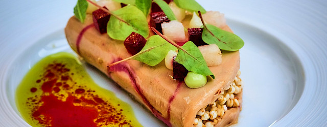 middenin. Vouw de ganzenleverplak dubbel en vul de randen met gepofte quinoa. Plaats