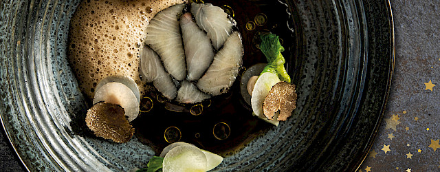 Breng de dashi bouillon aan de kook. Snijdt de beurre noisette in blokjes. Los de beurre noisette op door blokje voor blokje bij de bouillon te voegen en voortdurend te mengen met de staafmixer.