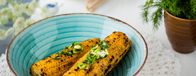 Laat de roomboter op kamertemperatuur komen. Snijd de kruiden fijn en voeg toe aan de roomboter. Breng op smaak met peper en zout. Ook erg lekker als je er een uitgeperst teentje knoflook aan toevoegt. Grill de maïskolven ongeveer 10 tot 15 minuten op de barbecue. Draai regelmatig om en serveer met de kruidenboter.