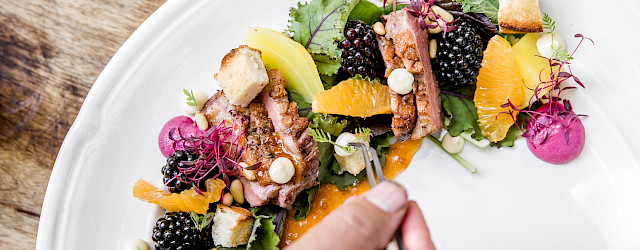 Hoofdgerecht 'Gerookte eendenborst met sinaasappelglaze, gepofte bieten en een boerenkoolsalade met gemarineerde bramen'