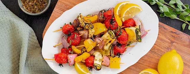 Groentespiesjes gemarineerd in een oregano-citroen mix van de BBQ