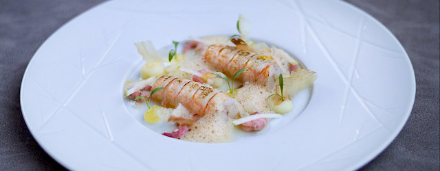 Maak de langoustine schoon en brand de staartjes kort met een koksbrander. Breng op smaak met vinaigrette en fleur de sel. Serveer lauw/warm.
