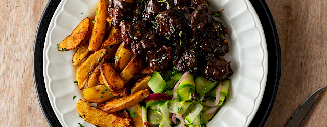 10. Serveer het zoervleis met de aardappeltjes en de frisse komkommersalade (zie hier beneden).