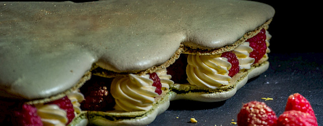 • Leg de bodem op een taartkarton. Spuit hier een toefje botercrème en leg er meteen een frambbos er tegenaan. Wissel dit af.