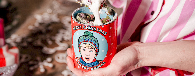 • Werk af met poedersuiker sneeuw en wat verkruimelde gevriesdroogde framboos