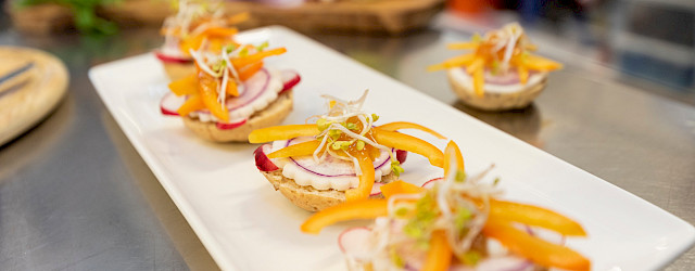 Snijd de broodjes doormidden en besmeer iedere helft met roomkaas. Steek met een vorm een plak geitenkaas uit en beleg het broodje ermee. Voeg vervolgens enkele dunne plakjes paarse radijs en dunne plakjes rode radijs toe. Snijd de oranje paprika doormidden en snijd één helft in dunne reepjes en leg deze in een stervorm op het broodje. Werk het geheel af met de chutney en garneer met radijssla.