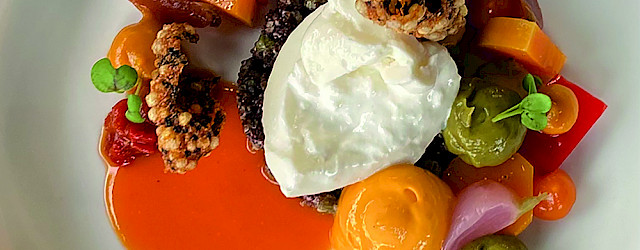 Maak de pompoen schoon en snijd de dikke kant in 24 stukjes. Deze stukjes marineren in olijfolie, azijn, suiker en zout. Maak van de rest van de pompoen een crème (garen in de oven en doordraaien in een keukenmachine). Draai de avocado’s glad in een keukenmachine met een beetje olijfolie, citroen, zout en peper. De quinoa afkoken in 500 ml water en een bouillon blokje. Schil de paprika’s en snijd deze in gewenste stukjes. Marineren met witte aceto balsamico en olijfolie. Afval van de paprika draaien in de keukenmachine en zeven door een fijne zeef.