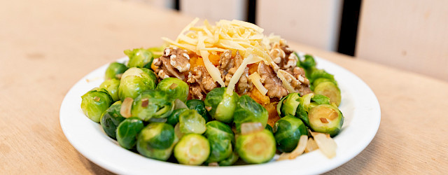 Schil de zoete aardappel en snijd deze in kleine stukjes. Kook gaar in water met zout en giet af. Stamp tot puree en giet er indien nodig een beetje melk bij om het smeuïger te maken. Maak vervolgens de spruitjes schoon en kook beetgaar in water met zout. Rooster de walnoten kort in de koekenpan en leg opzij. Snipper het uitje en bak even aan in de pan. Roerbak de spruiten mee en breng op smaak met de mosterd en wat peper en zout. Meng de spruiten met de zoete aardappelpuree en maak het bord op met wat walnoten en oude kaas eroverheen