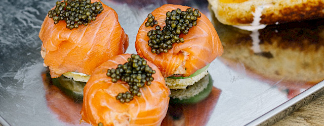 • Dek af met nog een plakje gerookte zalm en druk voorzichtig uit de ring.