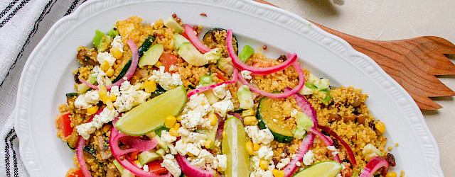 7. Meng nu de couscous met de gebakken groentes, maïs, tomaatjes, gepekelde rode ui, avocado en kruimel de feta als laatste over de salade. Besprenkel met het sap van een halve limoen (of meer).
