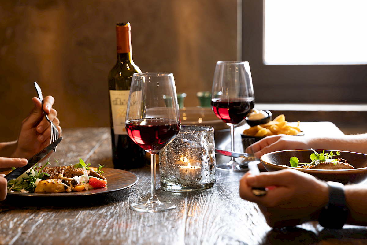 Een aperitief bij de open haard op de loungebank vormt het perfecte begin van de avond. In het interieur valt telkens iets nieuws te ontdekken: van de suède omslag van de menukaart tot het karaktervolle servies. Elk element is zorgvuldig gekozen om een gevoel van pure verwennerij en verfijnde gastvrijheid te bieden.