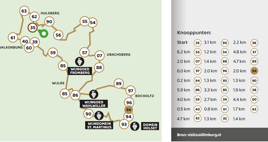 Deze fietsroute voert u langs het beste wat bourgondisch Limburg te bieden heeft. Dwars door het Limburgse Heuvelland trotseert u klim na klim. Onderweg komt u bekende Limburgse wijngaarden tegen, zoals Wijngoed Fromberg, Domein Holset, Wijngoed Wahlwiller en Wijndomein St. Martinus. In de maanden september en oktober kun je onderweg een van de wijnevenementen aandoen, of druiven plukken in Wijndomein St. Martinus.