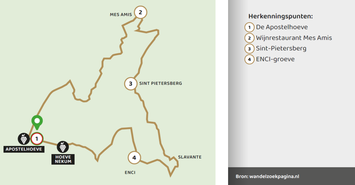 Vanaf de bekendste wijngaard van Nederland, de Apostelhoeve, loopt deze wandeling langs het riviertje de Jeker tot binnen de stad Maastricht. De route voert een stukje door het centrum, langs restaurant Mes Amis dat bekend staat om de Limburgse wijnen op de kaart. Via de oudste wijngaard van Nederland, Slavante, met prachtige uitzichten over de Maas en de hellingen van de Pietersberg komt u uit bij Hoeve Nekum aan de voet van de Louwberg.