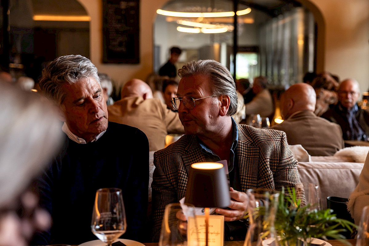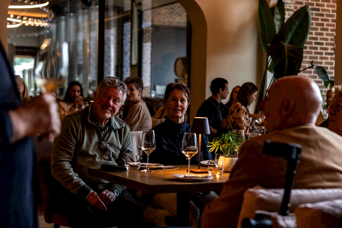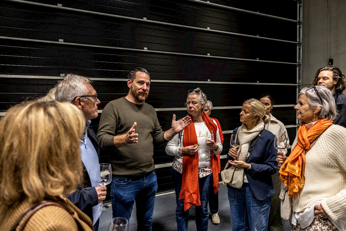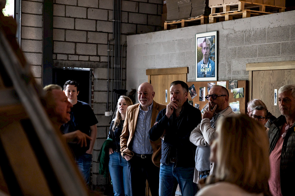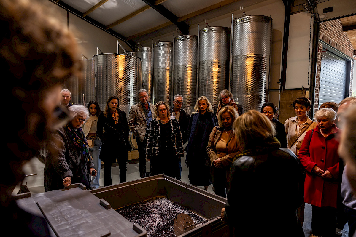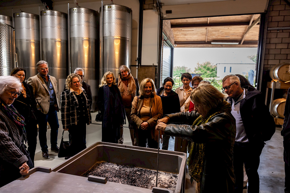 Onze eerste stop was Wijndomein Aldeneyck, waar Karel Henckens ons warm verwelkomde. Met veel enthousiasme vertelde hij hoe terroir en vakmanschap samenkomen in zijn wijnen. Vervolgens gingen we naar Wijnlandgoed Sterreheim, waar Gerjan Schijlen ons meenam in de droom die nog volop aan het ontwikkelen is. Zijn bevlogenheid en de veelbelovende eerste resultaten lieten duidelijk zien dat hier iets moois aan het groeien is. De dag sloten we af bij Wijndomein Heerenhuys D'r Pley, waar Pierre en Tineke Gubbels ons niet alleen hun wijnen lieten proeven, maar ons ook meenamen in hun indrukwekkende kunstcollectie. De combinatie van smaak en schoonheid maakte een onvergetelijke indruk op ons allemaal.