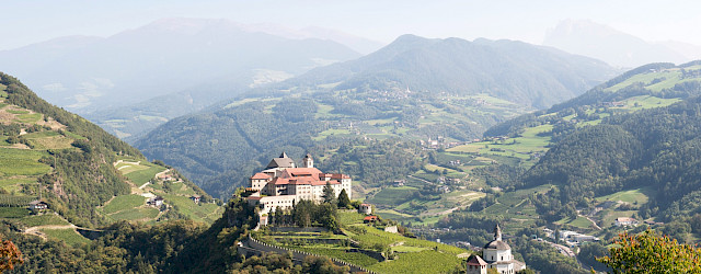 Waar je ook kijkt in Südtirol, overal zie je tweetalige opschriften zoals straatnaambordjes, wegwijzers, namen van winkels, menukaarten: alles wordt zowel in het Duits als in het Italiaans vermeld. Van de in totaal 500.000 inwoners van Südtirol/Alto Adige spreekt ongeveer 60% Duits en 40% Italiaans, en daarnaast spreekt ook nog een klein deel het Ladinisch, een oude Retroromaanse taal. De volgende dag is het na ‘törggel+truffel’ tijd voor wat extra beweging, en besluiten we een fiets te huren om vanuit Brixen de omgeving te verkennen. De eerste paar kilometers gaan langs de mooie oevers van de rivier de Eisack en kosten weinig moeite, maar zodra we omhoog fietsen richting wijngaarden wordt het toch wat lastiger. Bij wijndomein Pacherhof stoppen we voor een wijnproeverij, om kennis te kunnen maken met de maar liefst acht druivensoorten die wijnmaker Andreas Huber hier op in totaal negen hectare verbouwt. Eigenaresse Monika Huber en haar man Michael Laimer laten hem volledig de vrije hand bij het maken van de gerenommeerde witte wijnen, zoals Müller Thurgau, Sylvaner, Kerner, Pinot Grigio, Grüner Veltliner, Riesling, Gewürztraminer en Sauvignon Blanc. Pacherhof is een uiterst modern wijngoed, waar de wijnen eerst zes maanden in roestvrijstalen tanks tot rust komen alvorens verder te rijpen in houten vaten van Frans eikenhout en acaciahout. Ruim 80% van de totale jaarproductie van 130.000 flessen blijft in eigen land, de rest is voor de export. Slimme jongens die Italianen, die weten wel wat lekker is!