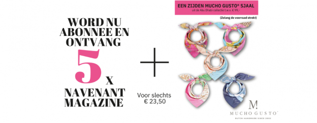 Het Navenant abonnement, inclusief het welkomstgeschenk, bedraagt € 23,50. Na een jaar bedraagt het abonnement € 16,50. Tevens als cadeauabonnement verkrijgbaar. De aanbieding met de zijden sjaal als welkomstgeschenk wordt aangeboden door MUCHO GUSTO®. De zijden sjaal komt uit de MUCHO GUSTO® Abu Dhabi collectie. De waarde van zijden sjaal is € 99,-.