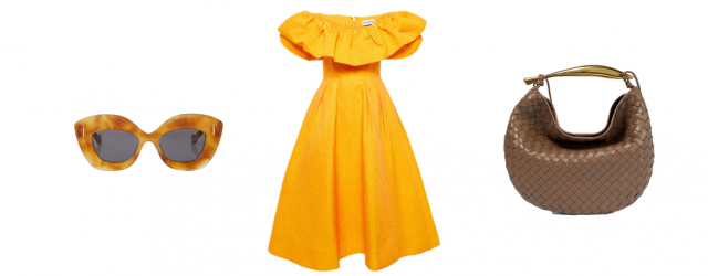 - Oranje off-shoulder geplooide midi-jurk / € 650,- / www.rebeccavallance.com