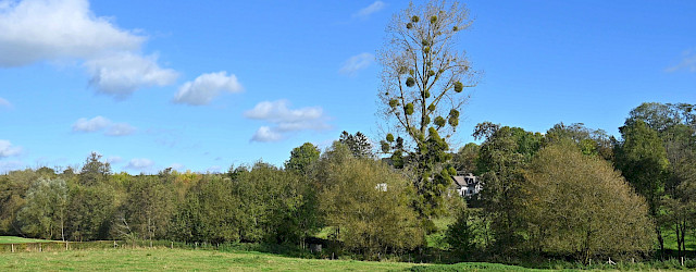 Op deze zonnige najaarsdag genieten een stuk of drie 'alpenkoeien' van het nog frisse, groene gras. De toppen van een hoge populier, die met kop en schouders boven de rest van de begroeiing uitsteekt, zijn versierd met bolvormige maretakken. Alsof de kerst al gevierd kan worden. De populier lijkt weinig last te hebben van deze halfparasiet. Dit iconische beeld uit Zuid-Limburg is vaak ook te zien bij de hoogstamboomgaarden. Hoe dan ook, het is zeker een prachtig gezicht. De schrille roep van de ijsvogel, gevolgd door een vliegensvlugge blauwe flits, brengt me terug naar de werkelijkheid. Het is duidelijk dat er in het kleine waterstroompje ook nog wat te vissen valt.