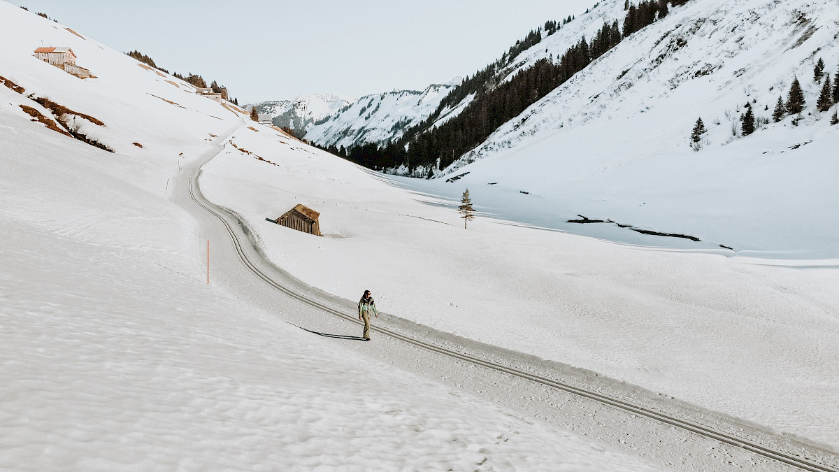 De volgende ochtend ontmoeten we gids Erwin in het dorp Mellau voor een sneeuwschoenwandeling. Na een korte kennismaking nemen we de skilift naar Rossstelle. In de lift legt Erwin uit hoe we de sneeuwschoenen - een soort tennisracket die onder onze schoenen worden gebonden - moeten gebruiken. We stappen uit bij het kabelbaanstation op 1400 meter hoogte en beginnen rustig aan onze sneeuwschoenwandeling door idyllische landschappen. In het begin voelt het wat onhandig, maar na enkele minuten wandel ik soepel over de sneeuw.