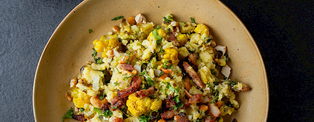 5. Bak hierna ook kort de spekjes in de pan (afzonderlijk van de bloemkool).