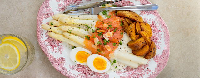 11. Leg de asperges op een bord, giet de Parmigiano Reggiano saus eroverheen en leg hierop per bord 100 gram gerookte wilde zalm. Garneer af met de geroosterde amandelen, wat verse fijngesneden peterselie en een beetje vers citroensap. Leg het zachtgekookt eitje en een portie gebakken aardappeltjes erlangs.