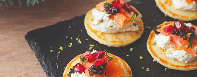 Blini’s met ricotta, zalm en granaatappelpitjes