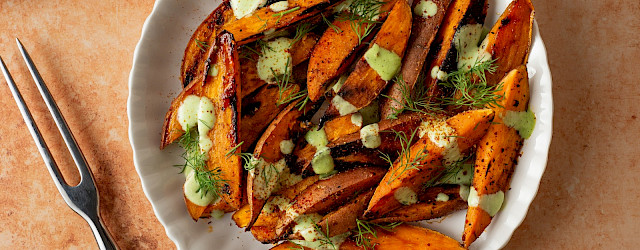 Geniet van de zoete, rokerige smaak van gegrilde aardappelplakken, gecombineerd met een frisse dille-basilicumsaus. Dit kleurrijke en gezonde gerecht is eenvoudig te bereiden en brengt zomerse smaken direct op je bord.