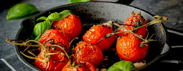 Kneus de knoflooktenen (dit doe je door met de vlakke kant van een groot mes het knoflookteentje plat te drukken). Kijk uit dat je het snijvlak van je hand afwijst. Snijd 1 teentje in kleine stukjes en meng met de olijfolie, Italiaanse kruiden, zeezout en peper. Leg de tomaten in het schaaltje of pannetje en giet hier de olie met kruiden overheen. Leg de andere 2 knoflooktenen (niet gepeld) erbij. Zet nu 30 minuten in een voorverwarmde oven op 200 graden Celsius. Let op: dit kan per oven kan verschillen. Ze zijn klaar als de tomaten verschrompeld zijn. Laat ze even afkoelen voordat je ze eet. Strooi er nog wat verse basilicum over om het af te maken. De knoflooktenen zijn nu ook heerlijk gepoft en kun je er lekker bij eten.