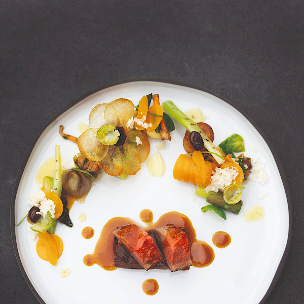 Het hoofdgerecht is samengesteld door chef Emile Maessen van Restaurant OH30 in Weert. “Gebraden reerug met gebakken bloedworst, crème van butternut pompoen, spruitenblad, pastinaak, gekonfijte aardappel en vanille en een jus van koffie”. Een hoofdgerecht dat OH30 à la carte serveert en dat volgens Emile perfect in het najaar past. “Ree vind ik het mooiste product om mee te werken in het wildseizoen. De smaak is wat specialer en meer uitgesproken, de toevoeging van vanille en abrikoos maken het wat zoeter. De aardappel zorgt voor de crunch en bite, de pompoen voor het zalvige. De jus, licht gearomatiseerd met koffie, maakt het umamiplaatje rond.”