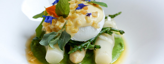 Hoofdgerecht 'Limburgse asperge op een puree van daslook met gestoofde lamsoren en een gepocheerd eitje met een luchtig schuim van witbier en vinaigrette van gerookte boter'