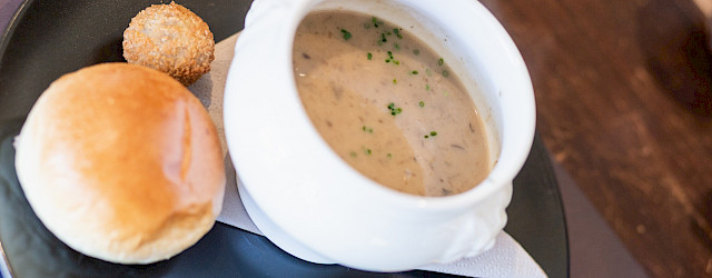 Maak de bospaddenstoelen schoon en snijd ze in stukken. Snipper de ui en zweet deze in een pan aan met een klontje boter. Voeg de paddenstoelen toe en laat gaar worden. Voeg daarna de bouillon toe en laat vijf minuten pruttelen. Voeg vervolgens de room toe en breng soep opnieuw aan de kook. Pureer de soep glad met een staafmixer, maar niet te fijn, er mogen nog stukjes paddenstoel zichtbaar blijven. Breng de soep op smaak met peper en garneer met de fijngesneden bieslook en een knapperig broodje erbij.